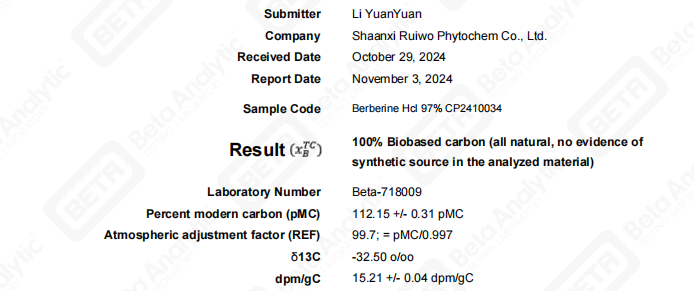 C14 is used to test whether the plant source is natural, and the report shows that our berberine hydrochloride is a natural source. You can ensure that you are investing in a safe and effective supplement.
